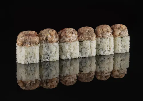 Краб, манго, авокадо, соус трюфель, икра лосося, крем-чиз, рис