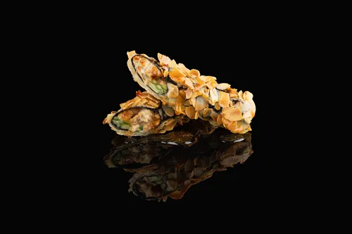 Опаленный лосось, фисташки, крем-чиз, огурец, соус шрирача, унаги юдзу