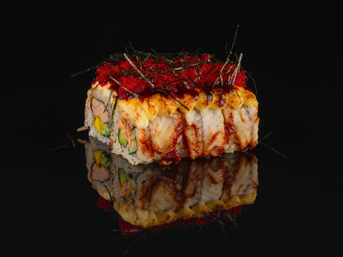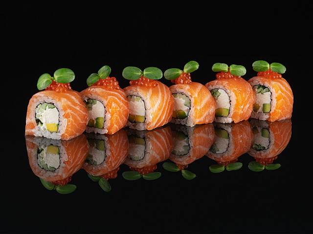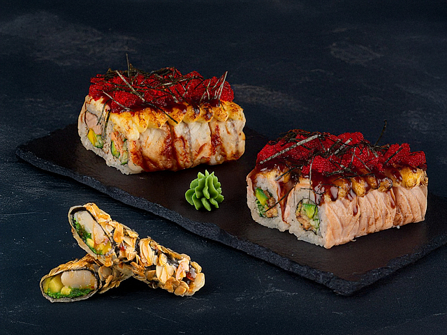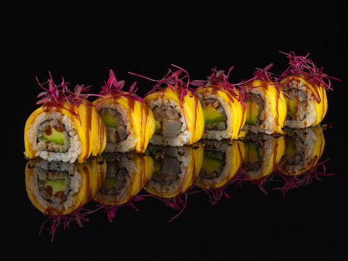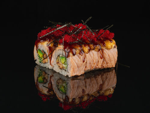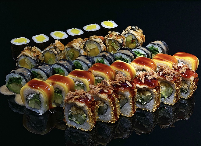 Лосось, угорь, авокадо, омлет, тобико, унаги юдзу, сырный соус