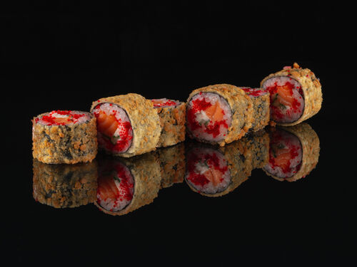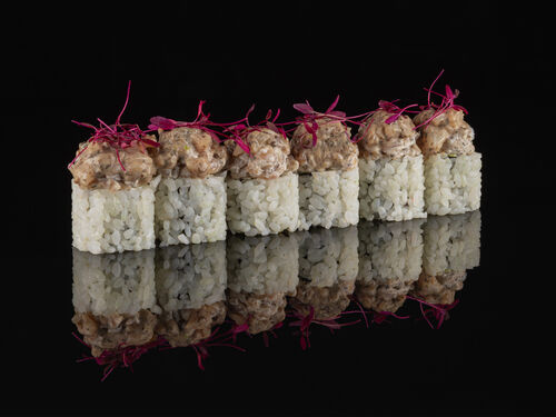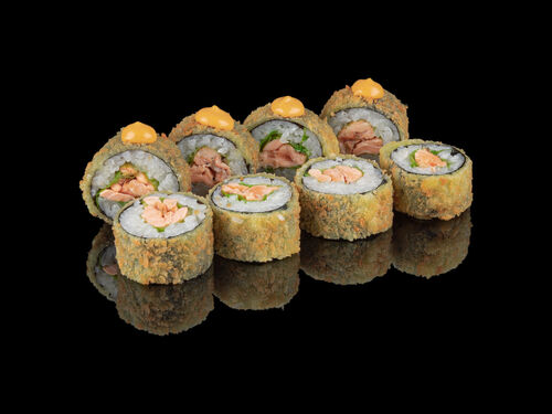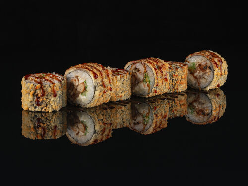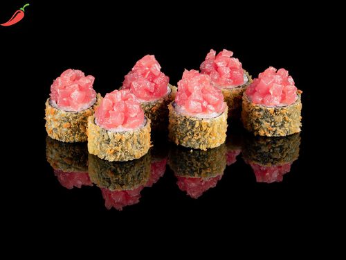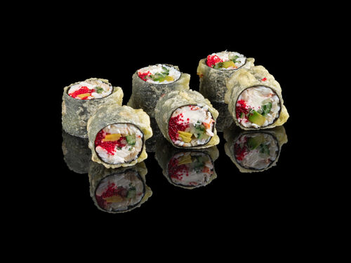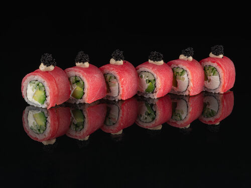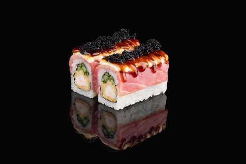 Тунец, креветка темпура, огурец, авокадо, тобико, унаги юдзу, сырный соус, рис, нори