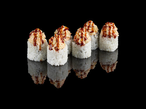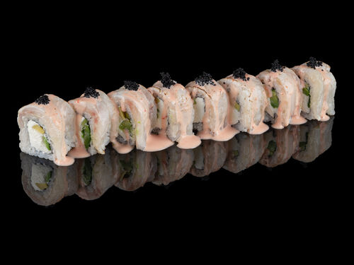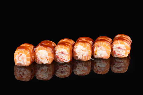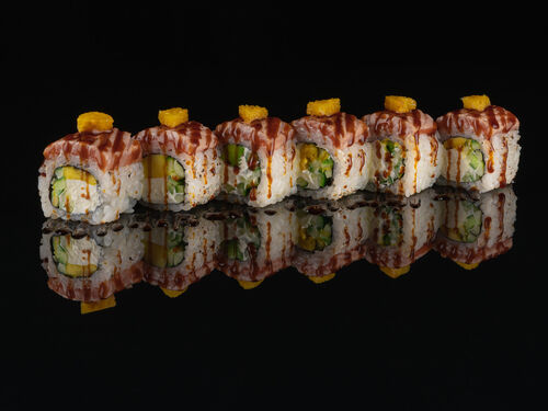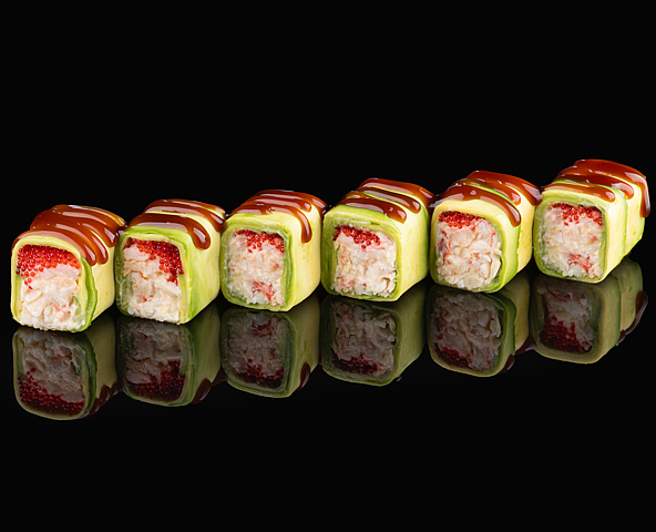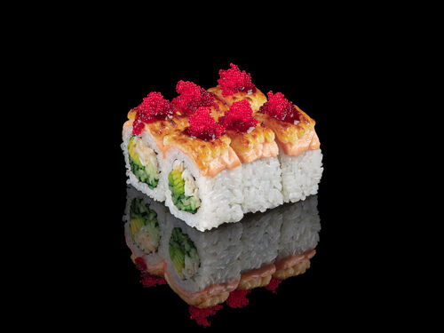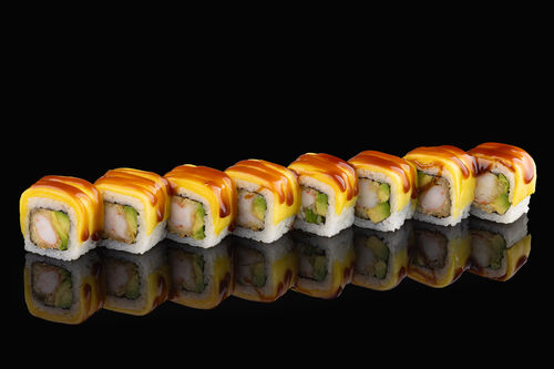 Лосось, краб, тобико, авокадо, огурец, сырный соус, унаги-юдзу