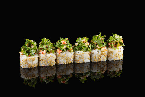 Креветка, крем-чиз, авокадо, руккола, кунжут, тобико, спайси-соус