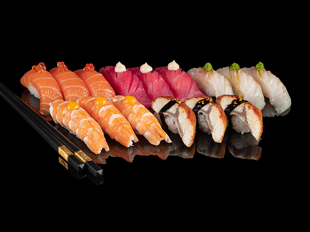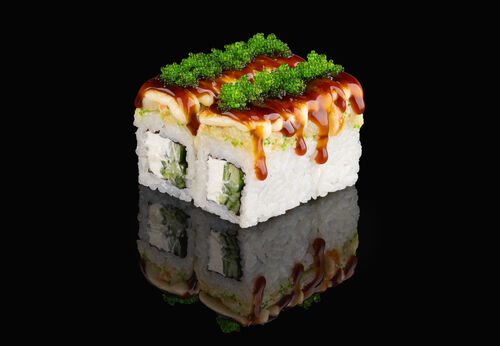 Угорь, лосось, огурец, омлет (яйцо, соевый, соус, сахар), тобико, унаги юдзу, сырный соус