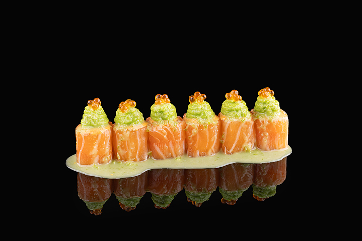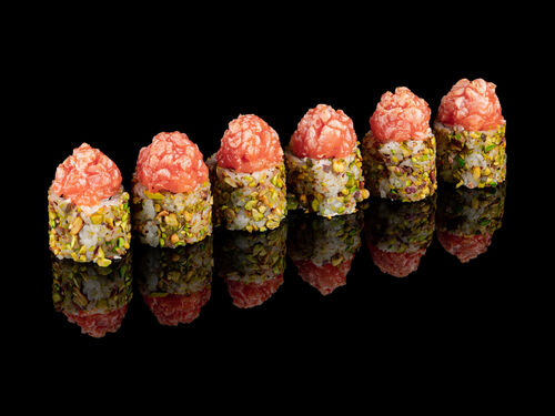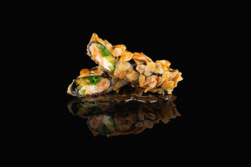 Опаленный лосось, фисташки, крем-чиз, огурец, соус шрирача, унаги юдзу