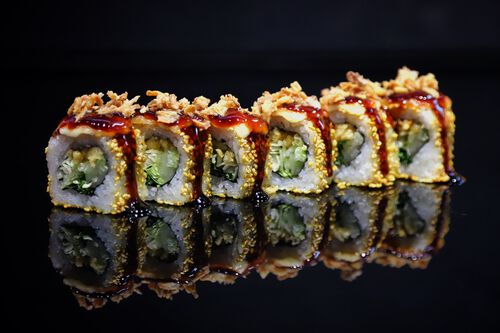 Огурец, тофу, авокадо, соус из постного майонеза и живых дрожжей, луковые чипсы, соус унаги