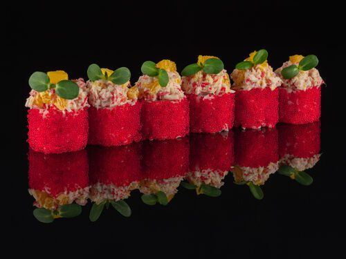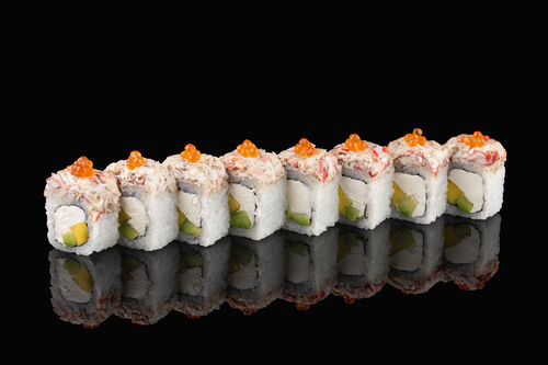 Краб, манго, авокадо, соус трюфель, икра лосося, крем-чиз, рис