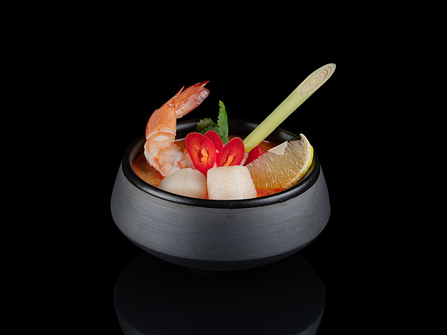 Гребешок, манго, тобико, миндаль, соус чили сладкий
