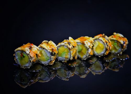 Манго, авокадо, майонез, миндаль, тофу, соус чили, соус унаги